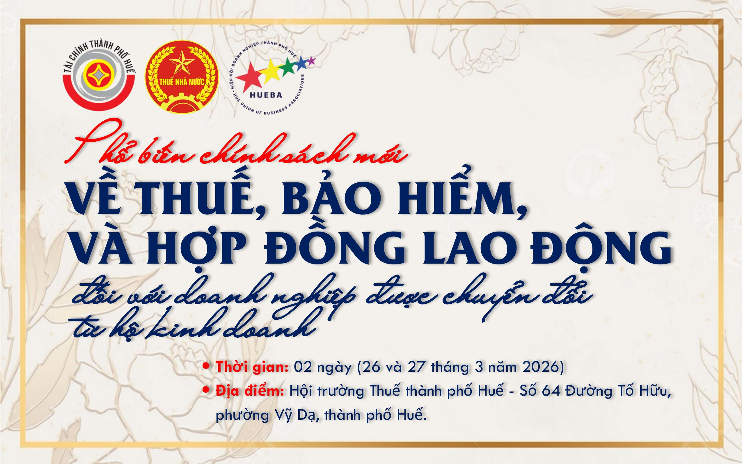 Mời tham gia Hội nghị phổ biến chính sách mới về thuế, bảo hiểm và hợp đồng lao động đối với doanh nghiệp chuyển đổi từ hộ kinh doanh (23/03)
